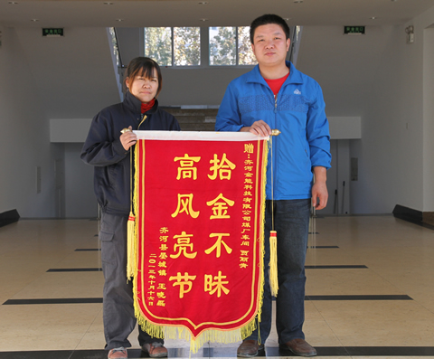 10月17日一大早,家住晏城鎮(zhèn)的村民王曉磊將一面繡有“拾金不昧,高風亮節(jié)”的錦旗送至金能公司,感謝公司員工賈麗青的拾金不昧。