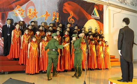 本次比賽是公司參賽人數最多,啦啦隊最龐大的一次,參賽人員近400人,啦啦隊也達400余人,場面頗為壯觀。為做好本次比賽,各隊“八仙過海,各顯神通”,充分的準備,新穎的創意,讓比賽增色不少。其中,綜合組小朋友領唱的《歌唱祖國》,在《打靶歸來》的曲目中,身著綠軍裝、頭戴紅五角星軍帽,隨音樂翩翩起舞,成為比賽的一道最靚麗風景線;四廠合唱《咱們工人有力量》時,頭戴黃安全帽,圍著白毛巾,戴著白手套,整齊劃一,展示了當代工人的良好精神風貌,演唱《眾人劃槳開大船》時,最初以大船的形狀呈現,與歌曲內容吻合;辦公組的真、假聲的科學運用,受到了專業評委的贊揚。經過激烈角逐,辦公組拔得頭籌,綜合組屈居亞軍,四廠贏得比賽的第三名。