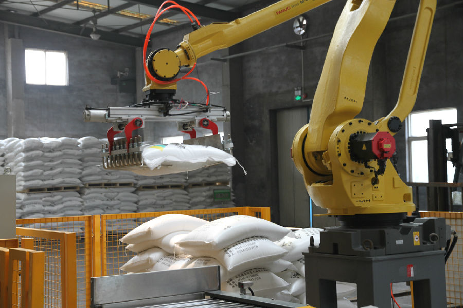 日前,公司投資60余萬元從日本進口了機械手,配套新上了整平機、皮帶及電子秤糾錯系統,用以硫酸銨的搬運打垛,現運行良好。投用后,大大降低了員工勞動強度,可減少操作人員6個(圖為機械手工作場景)。